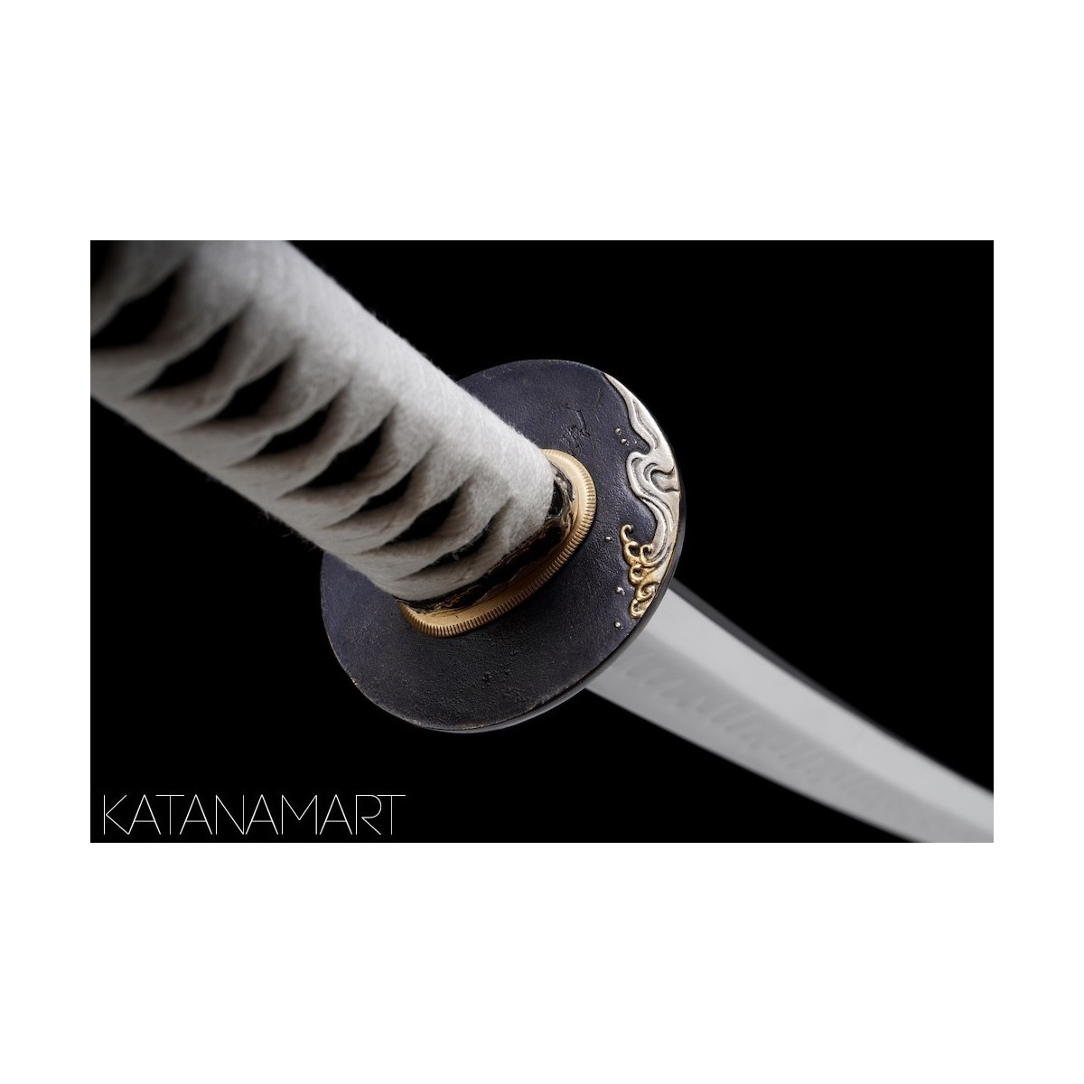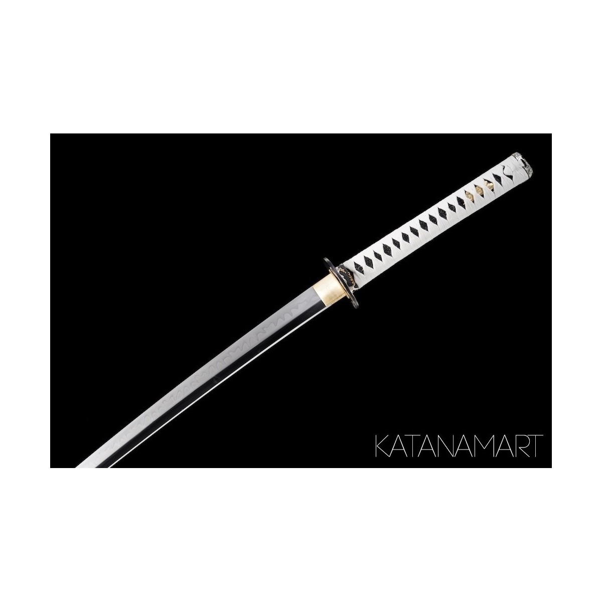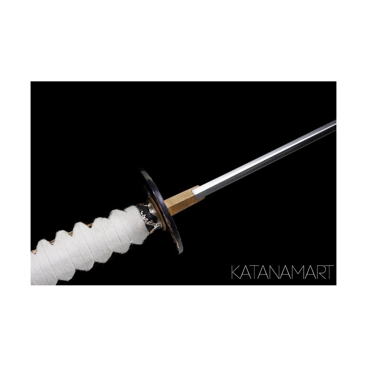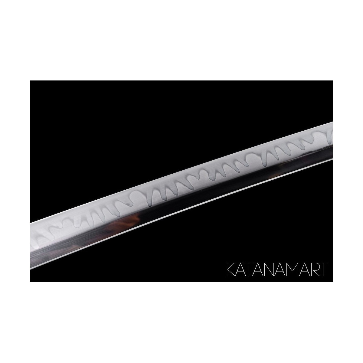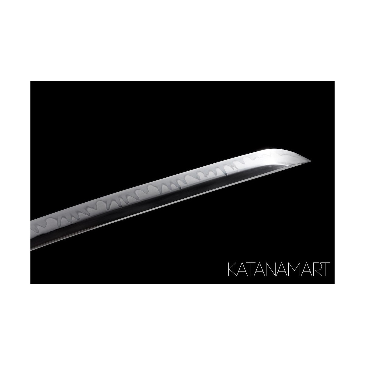 La Sakamoto Katana está fabricada artesanalmente con hoja de acero alto en carbono 1095, templada con arcilla para mejorar su estructura. El hamon estilo togari-gunome es claramente visible y resaltado por un pulido manual que acentúa cada ondulación. Esta espada es plenamente funcional, de tipo shinken, y construida pensando tanto en la precisión del practicante como en la admiración del coleccionista.