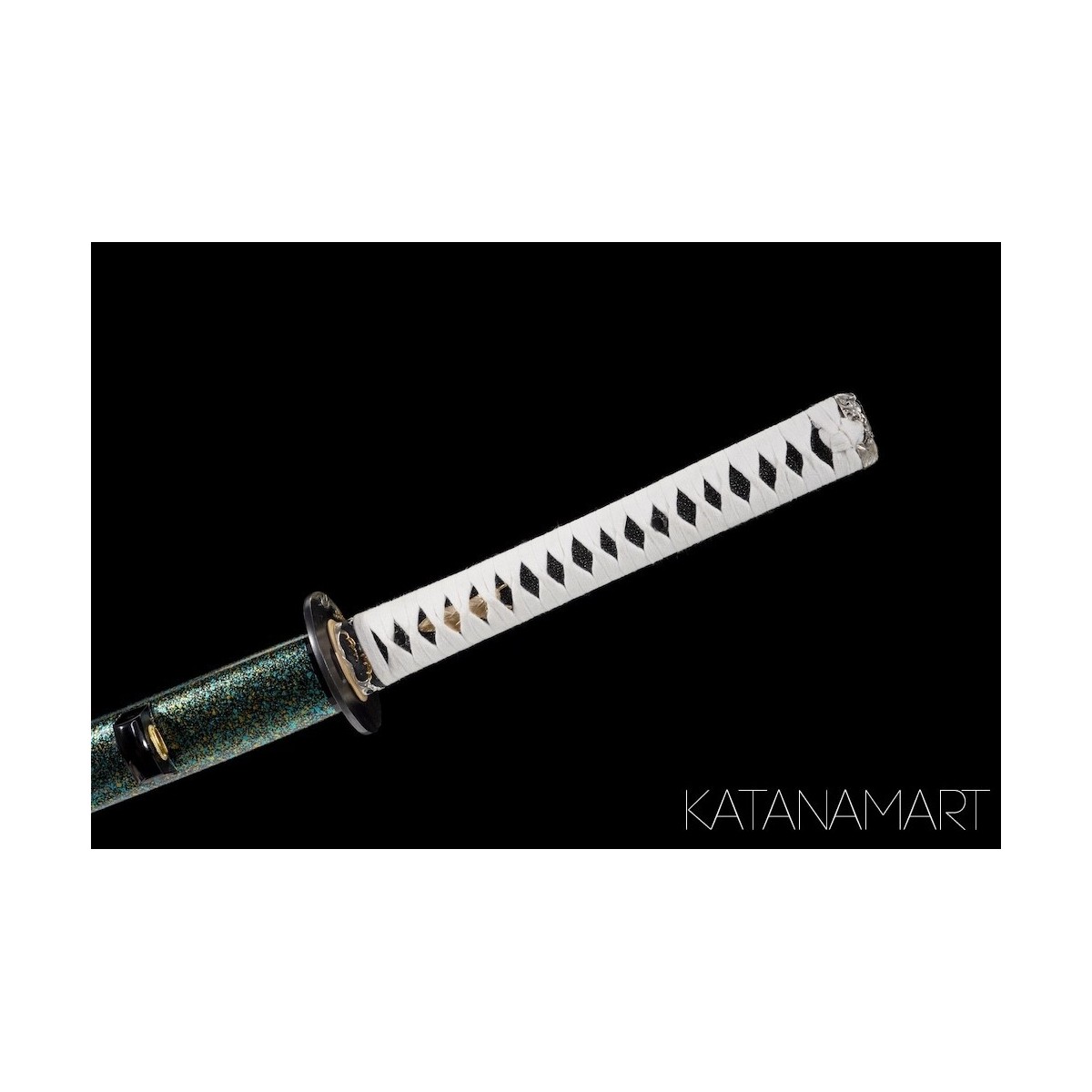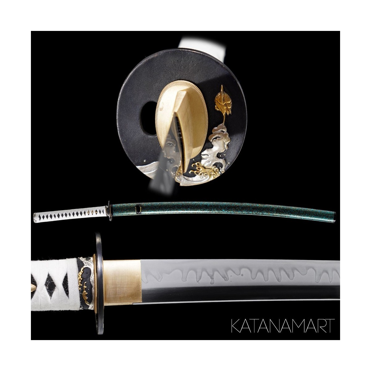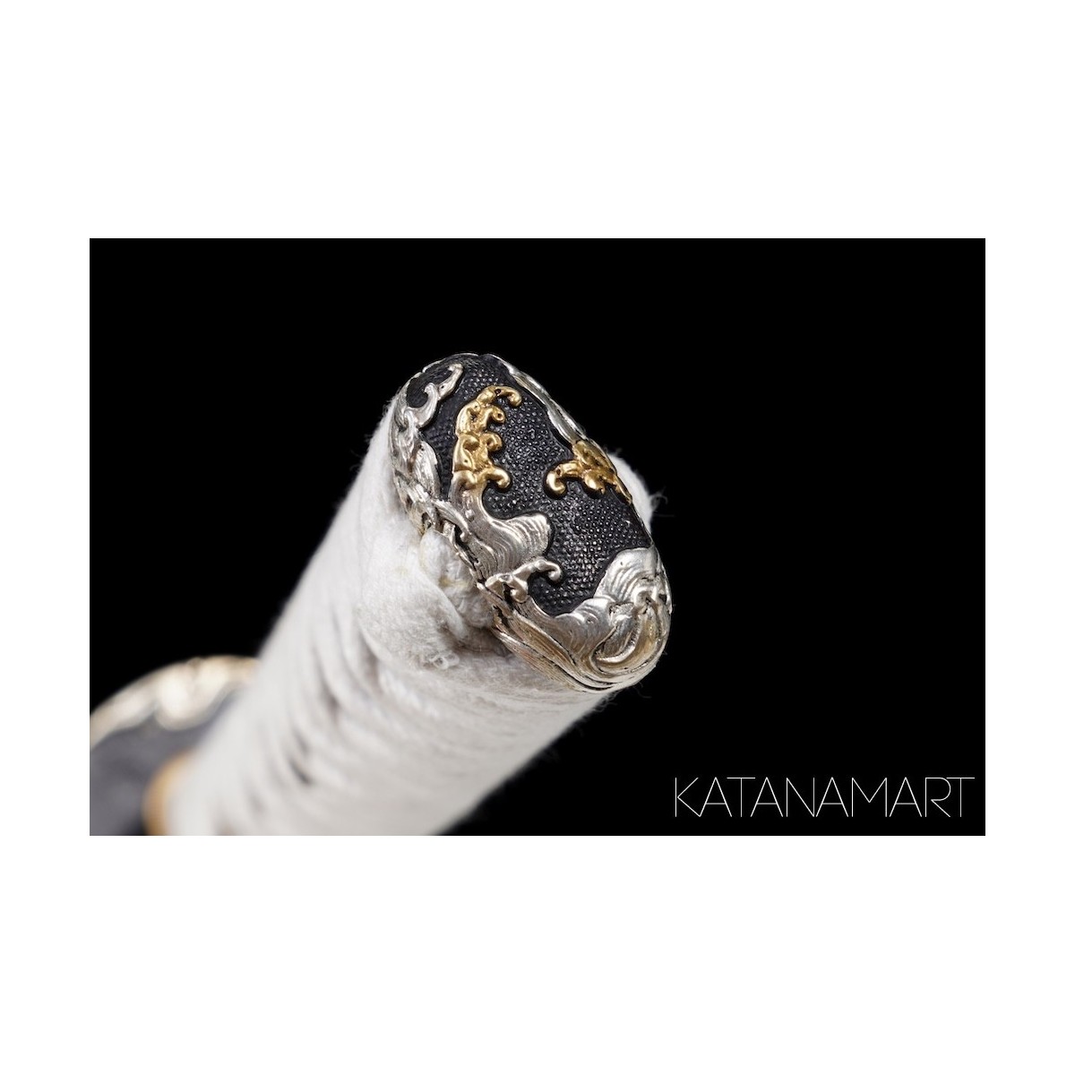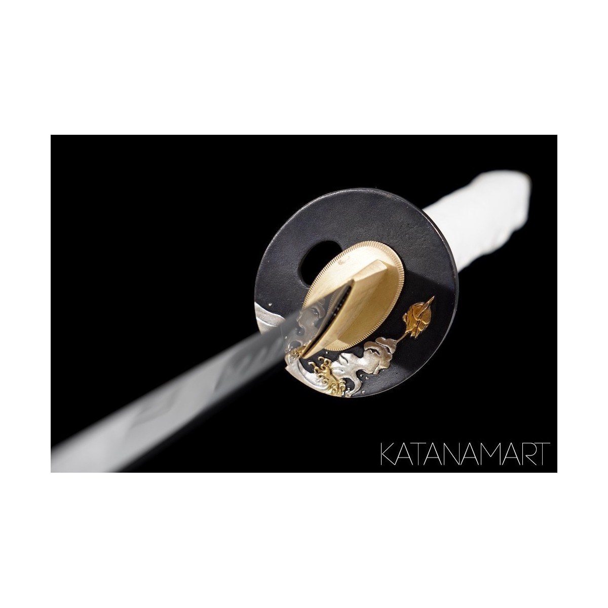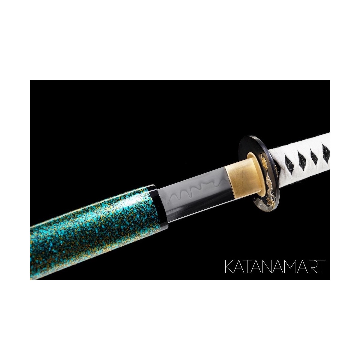 La Sakamoto Katana está fabricada artesanalmente con hoja de acero alto en carbono 1095, templada con arcilla para mejorar su estructura. El hamon estilo togari-gunome es claramente visible y resaltado por un pulido manual que acentúa cada ondulación. Esta espada es plenamente funcional, de tipo shinken, y construida pensando tanto en la precisión del practicante como en la admiración del coleccionista.