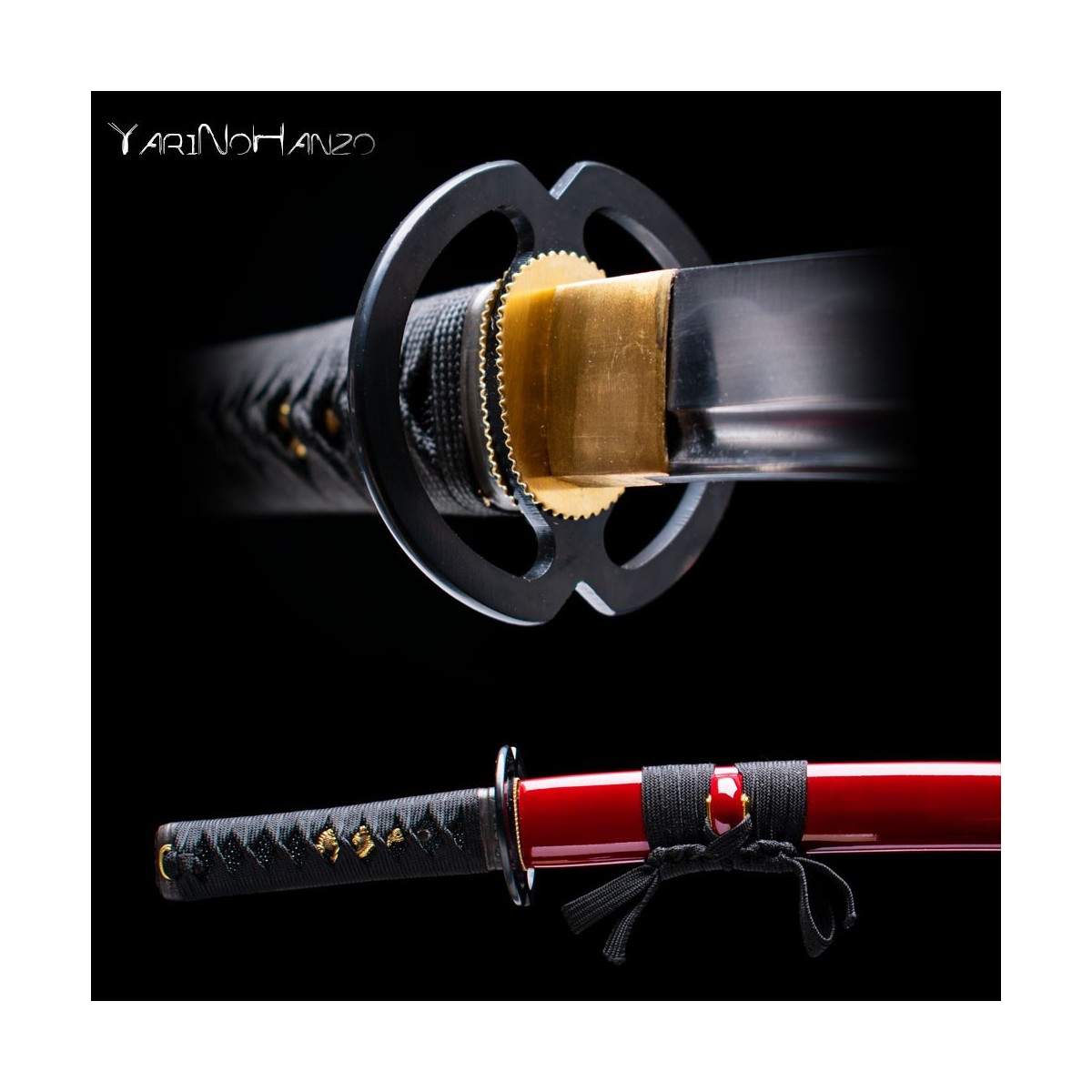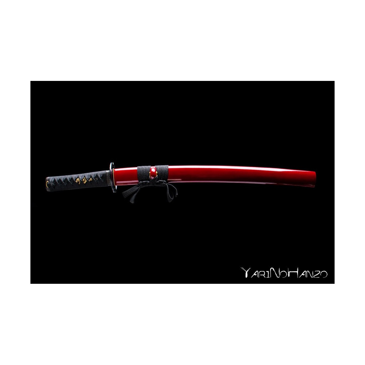 - Saya de madera lacada en rojo oscuro, tsukaito negro y tsuba de hierro.