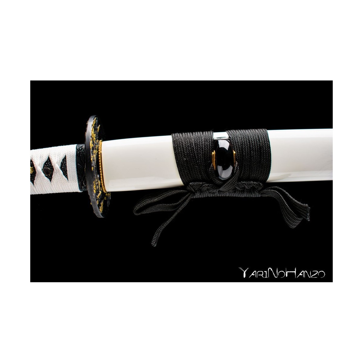 - Saya de madera lacada en colores negro/blanco, tsukaito blanco y piel de raya negra.