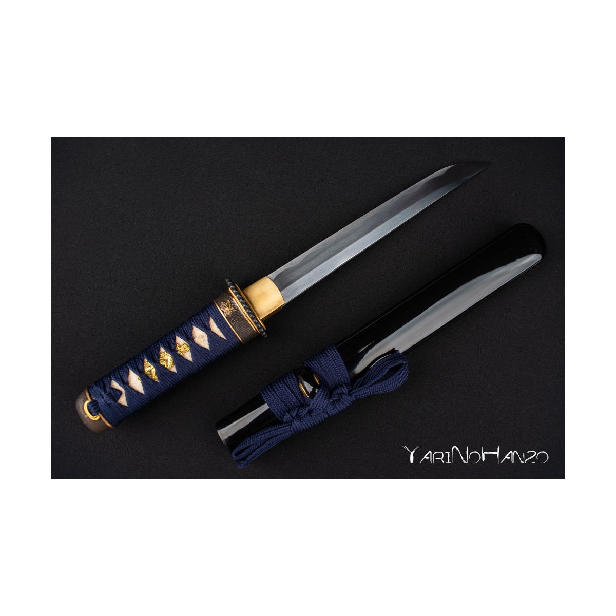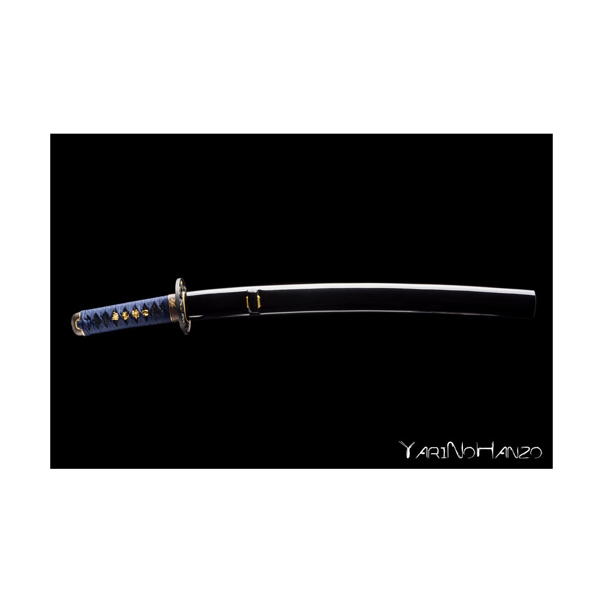Forjado en acero AISI 1060 con bohi, ofrece un diseño elegante con tsukaito azul sobre piel de raya auténtica, tsuba decorada y una saya negra lacada.