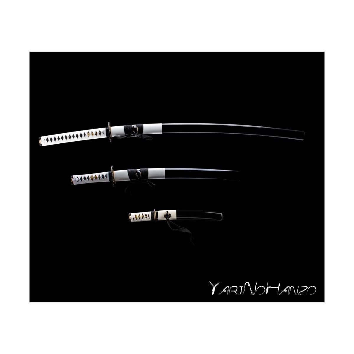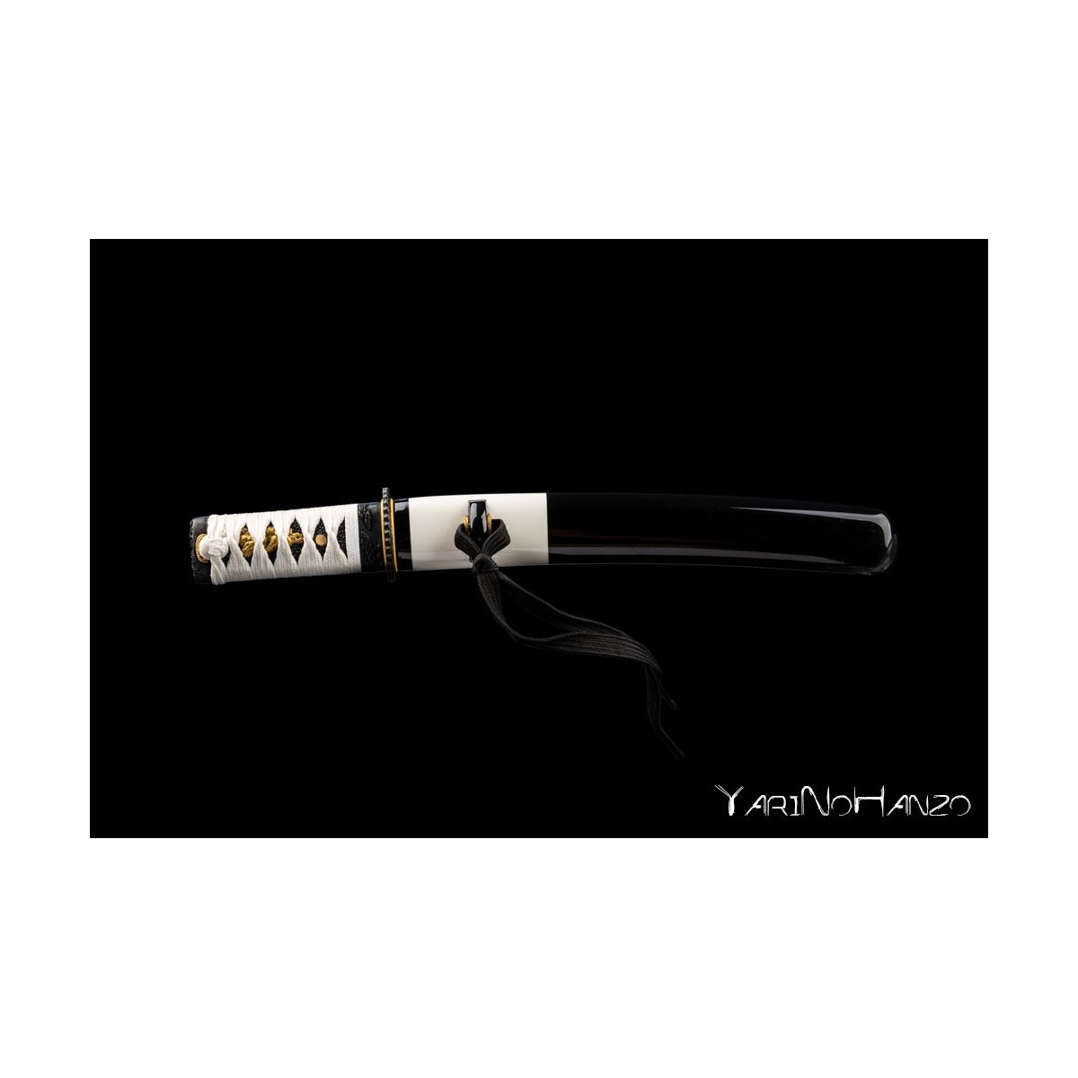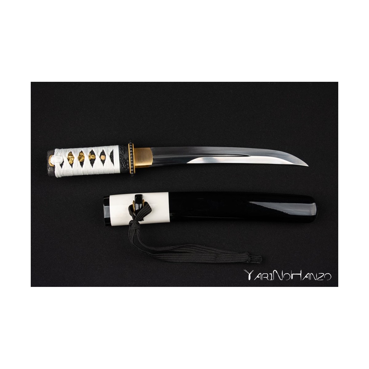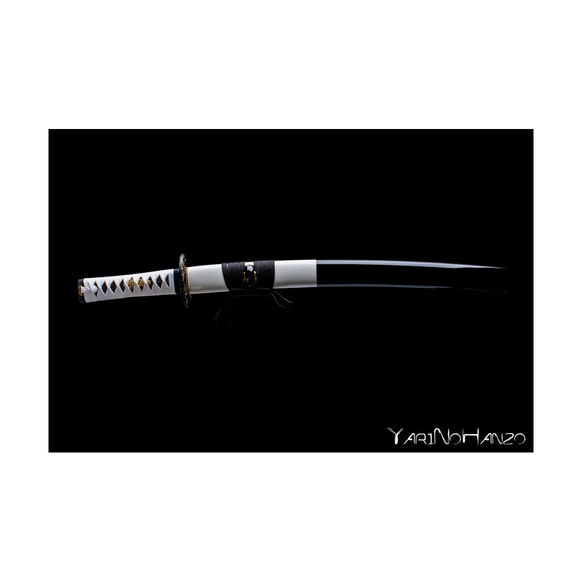 Forjado en acero AISI 1045 con bohi, destaca por su elegante combinación de saya lacada en blanco y negro, tsuka con tsukaito blanco sobre piel de raya negra y un diseño equilibrado.