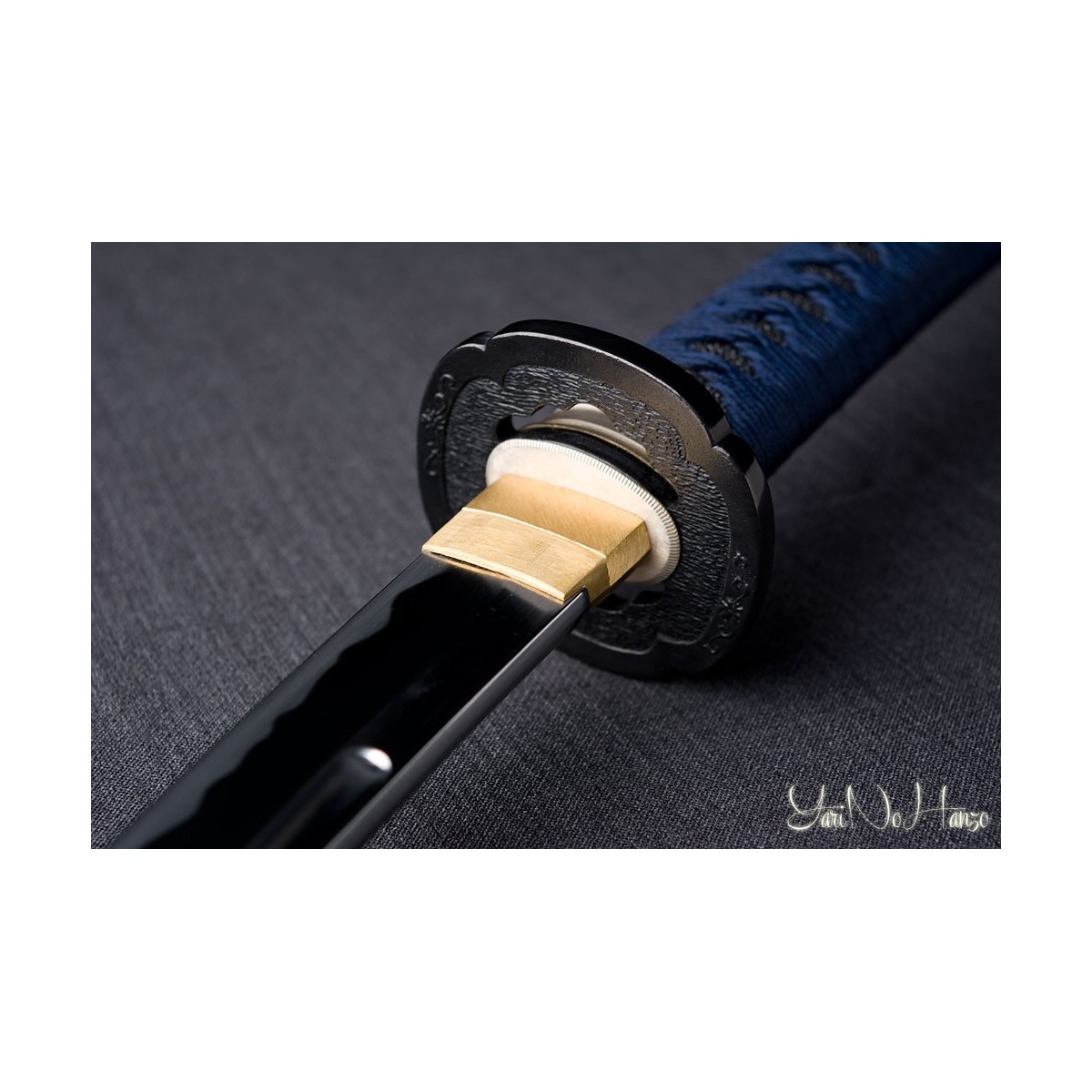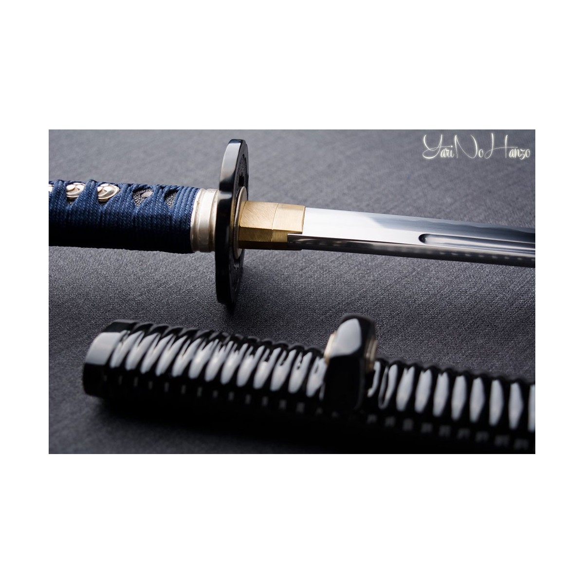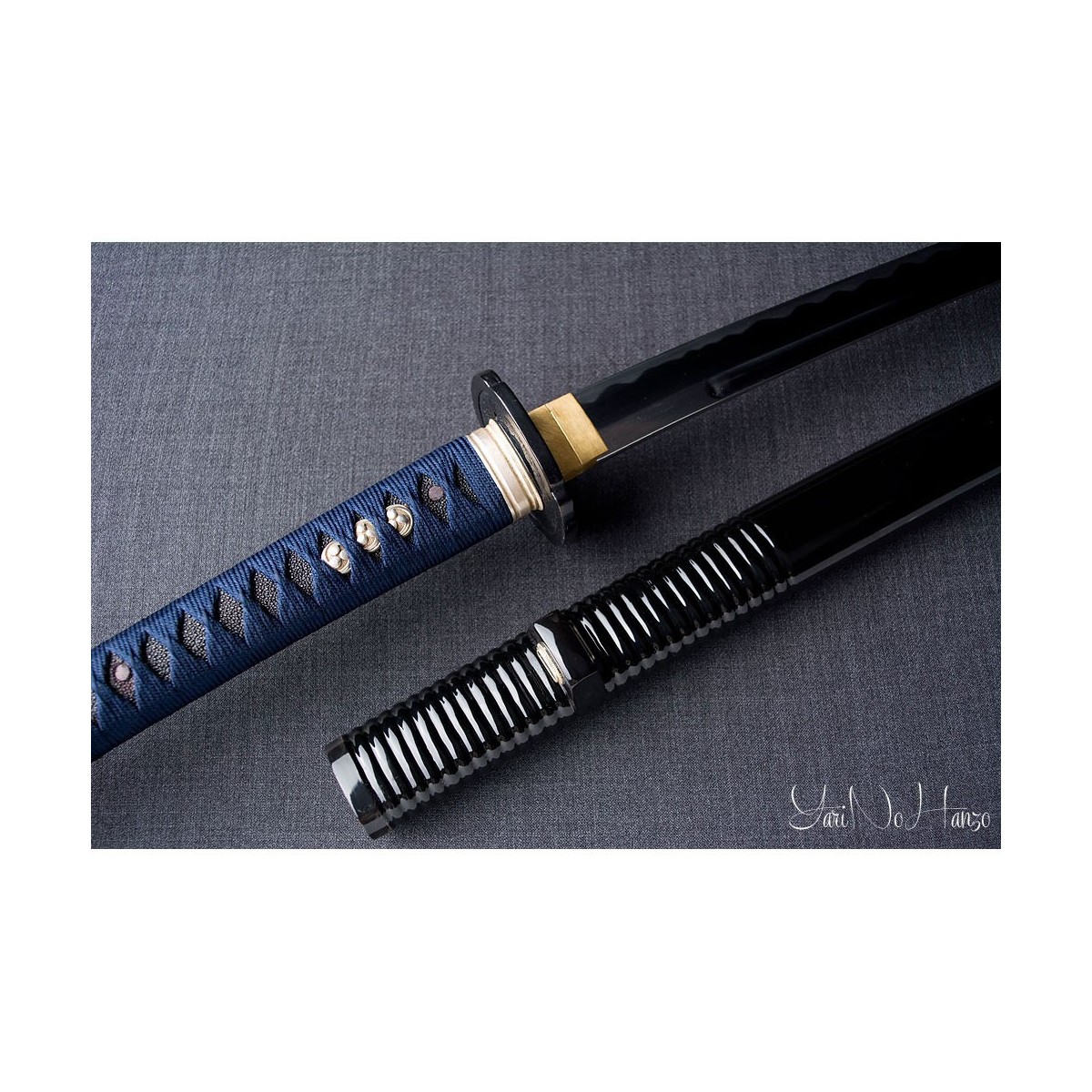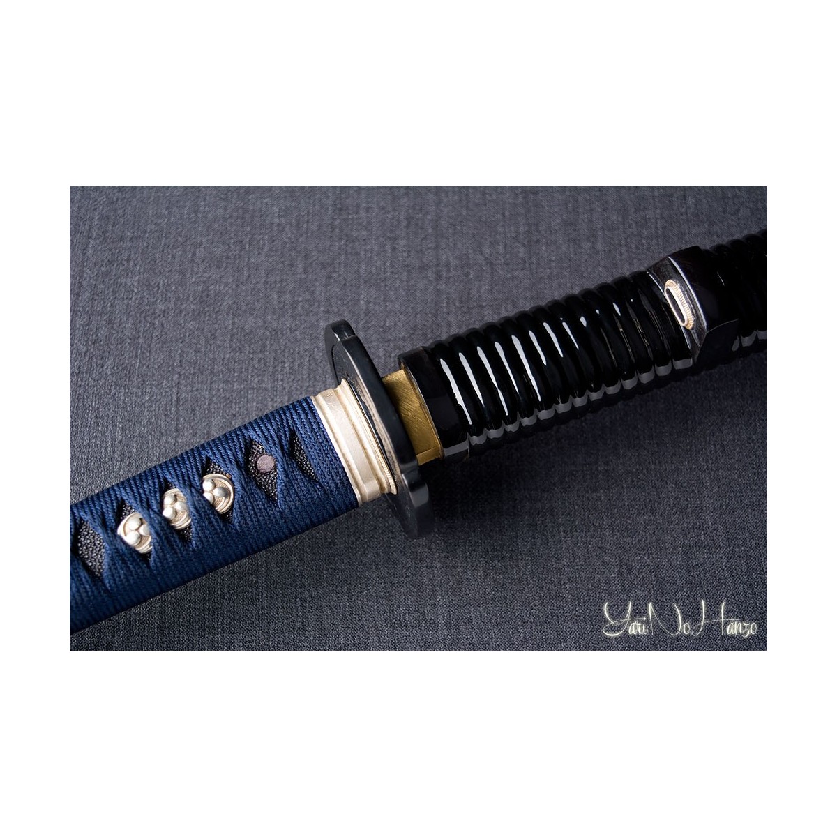 - Tsukaito de seda azul y estilo Tsukamaki Hinerimaki alterno con Hishigami.