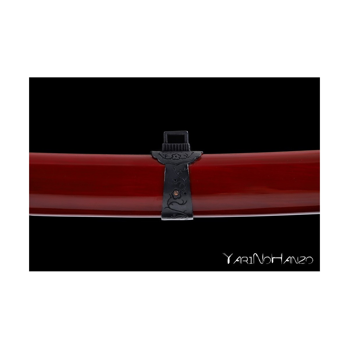 - Saya de madera lacada en rojo, con un acabado brillante impresionante que resalta su elegancia y resistencia.