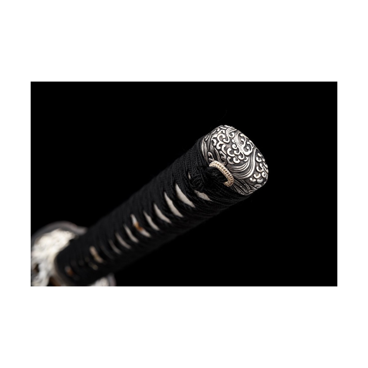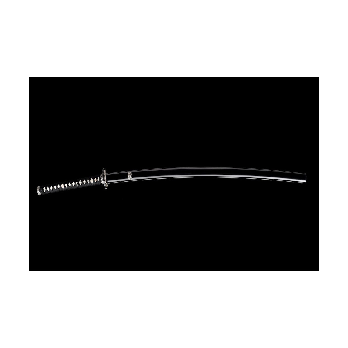- Tsukaito de seda negra, HECHO EN JAPÓN, con Tsukamaki estilo Hinerimaki alternativo con Hishigami y piel de raya real (Samegawa).