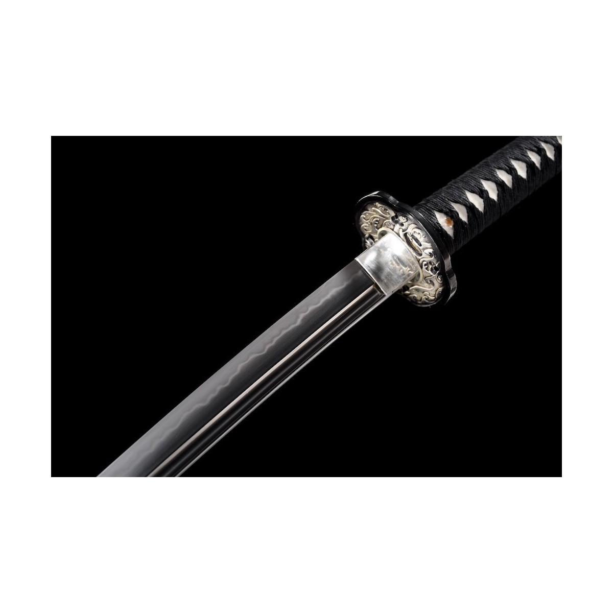 El Koshirae, inspirado en el movimiento y la fluidez del agua, presenta un diseño exclusivo con Tsuba, Fuchi y Kashira con temática Nami, evocando la armonía y la fuerza de la naturaleza. La tsuka, envuelta en seda negra de alta calidad Made in Japan, ofrece un agarre firme y seguro. Gracias a los hishigami, el tsukamaki mantiene su estructura con el tiempo, asegurando una sujeción impecable.